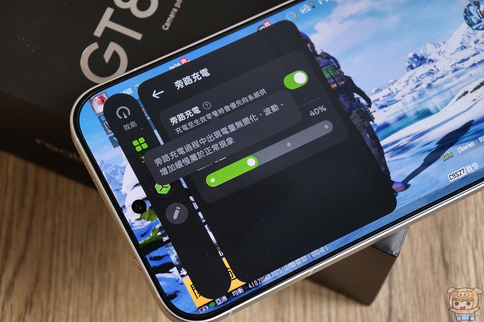 另外,realme GT8 Pro 也支援旁路充電技術,不過在 7000mAh大容量泰坦電池和軟硬體調效下,滿血狀態下,續航持久度已很有擋頭,基本上不太有常需要充電的需求,電池甚至還提供保障 5年壽命。