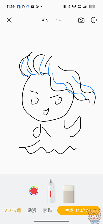 AI 塗鴉簡單說,就是你隨便撇幾下,AI 直接幫你生成一張彩繪風格塗鴉,不過實際用起來,覺得目前的效果還是有點偏「P 圖感」,原本手繪的味道會被沖淡,無法升成機率也高,希望後續版本能再調整一下,不過臨時要作張海報、社群貼文圖之類還可以啦。