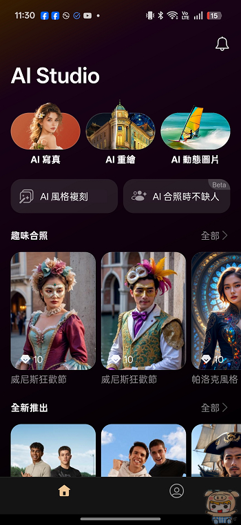 AI Studio 大家不陌生,直接用你拍好的照片,免費升成多款 AI 繪圖作品,包括 Q版塗鴉、油畫風格、漫畫風、太空、海邊等寫真,另外還有動態生成(AI Motion) 能將靜態的圖片,生成約 3秒的 1080P短影片或 live 動圖,也很適合用在網路社群上。