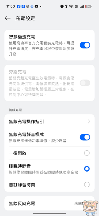 加上少見的 120W超級閃充充電器,最快能在 43分鐘內將電量從 1%充至 100%,無線閃充則支援 50W,建議可開啟智慧充電保護或充電上限功能,進一步延長電池使用壽命,另外,還支援 10W無線反向充電及旁路充電技術,完全讓你擺脫低電量焦慮。