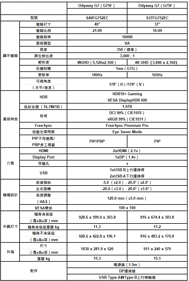Odyssey G75F 37吋、40吋曲面電競顯示器規格