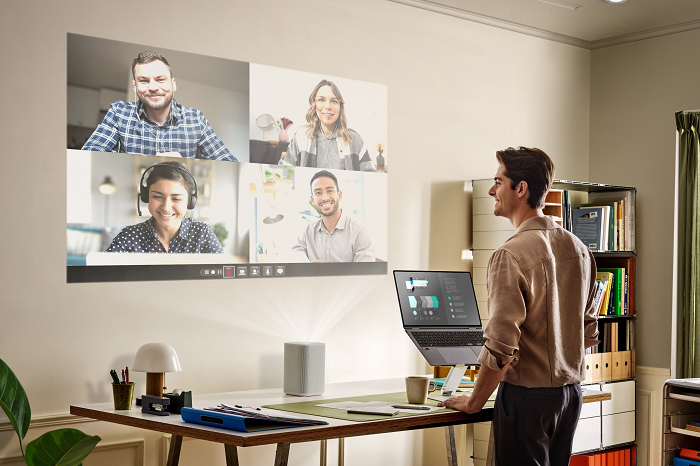 除可隨身智慧投影神隊友,更可使用內附的觸控螢幕腳架,透過紅外線攝影機與雷射投影技術結合,啟動嶄新觸控投影互動模式,並可於桌面或地面投射出 20~40 吋寬廣視野,並直接於投射畫面中進行觸控操作,甚至透過 Smart View 連結三星行動裝置,一秒與周遭親友共享掌中的珍藏畫面,自由揮灑各式生活應用。當下班後欲展開瑜珈紓壓時光,可將 YouTube 影片投影於地面,透過觸控播放或暫停鍵,輕鬆確認正確姿勢;或與閨蜜相約烘焙DIY,只需將教學步驟投影於工作檯面進行操作,巧妙避免弄髒手機或平板的尷尬情境;此外,觸控投影互動模式更適用多人操作情境,無論在家中臨時起意或是戶外露營時想來場親子共創塗鴉或是互動遊戲,眾人皆可一起動手參與,為珍貴時光創造更多樂趣。