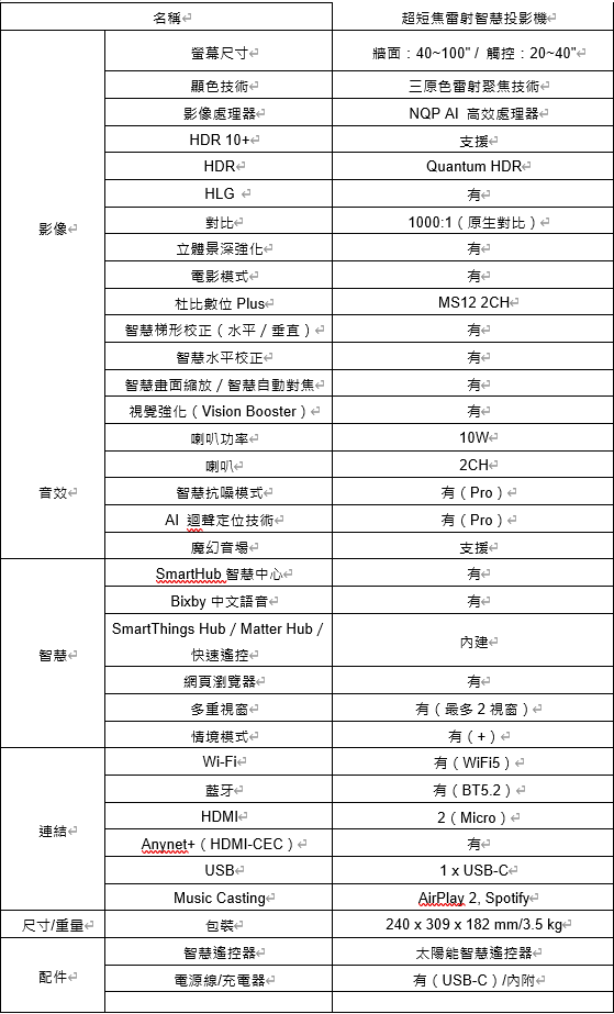 The Premiere 5 內建 Samsung Tizen OS,可直接觀看 Netflix、YouTube、Disney+ 等主流串流平台,無需額外裝置。內建 AI 遊戲助理與 GameBar 工具列,支援 21:9、32:9 畫面切換與多項遊戲優化設定,提升畫質與臨場感。支援 SmartThings、AirPlay 2 無線投影,手機、平板畫面可輕鬆同步至大螢幕;即使畫面關閉,也能持續串流音樂。配備太陽能智慧遙控器,支援中文語音操控、手機虛擬遙控器與智慧裝置控制,並相容 Matter、HCA 標準,打造完整智慧家庭體驗。