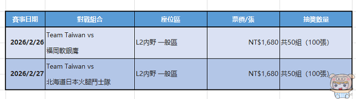 本次抽獎活動共提供「2026台日棒球國際交流賽」100組(200張)門票,讓幸運得主能親臨現場,為中華隊加油: