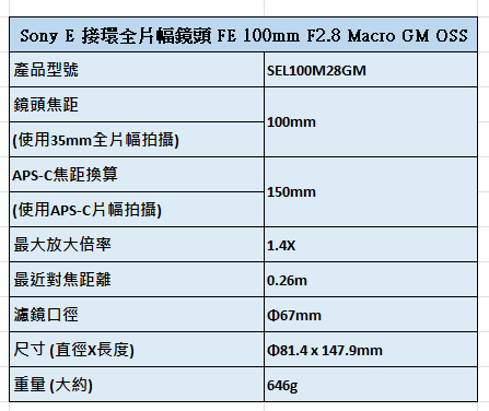 Sony E 接環全片幅鏡頭 FE 100mm F2.8 Macro GM OSS 規格