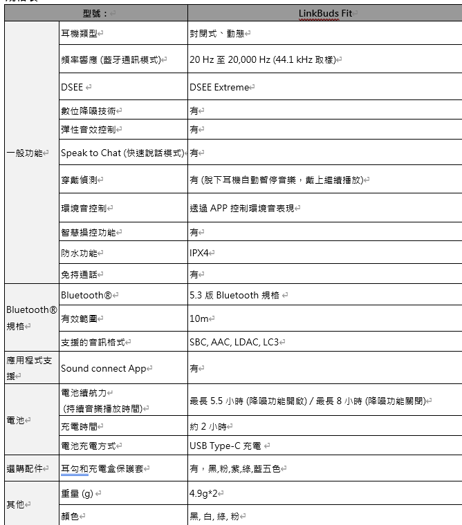 LinkBuds Fit 搭載Sony獨家開發整合處理器 V2晶片,可兼顧優異的降噪效能以及自然的環境音效,加上能重現清晰的中高音域,帶來高品質的聆聽體驗;支援應用程式 Sony | Sound Connect 可提供全面的智慧操控,滿足新世代享受科技便利的需求; LinkBuds Fit透過精心研發的設計提升配戴舒適性,再加上能加強穩定度的全新耳勾配件,不僅讓樂迷安心地在參與各種動態活動時都能有音樂陪伴,還可購入繽紛多色配件展現自我風格!
