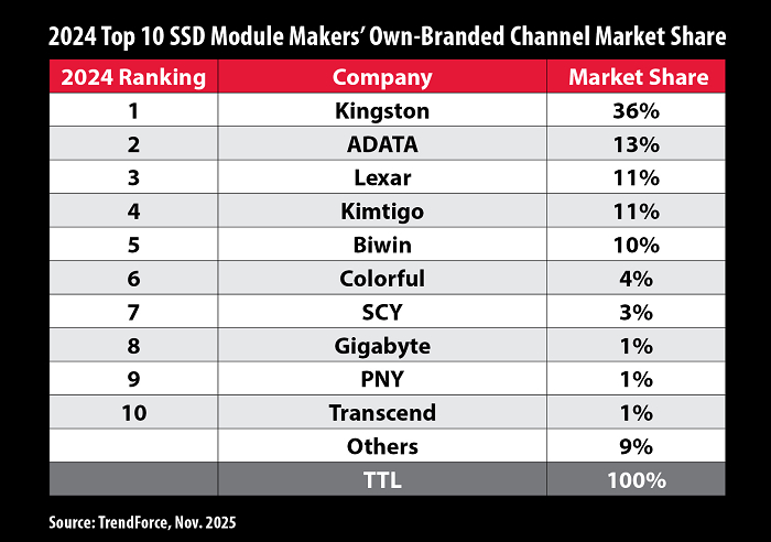 金士頓宣布,於 2024 年八度蟬聯全球 SSD 通路市佔冠軍。根據研調機構 TrendForce 最新報告顯示,儘管 2024 年全球 SSD 通路出貨量因市場疲軟較前年下滑 14%,金士頓卻逆勢突破,以高達 36% 的驚人市佔率再創歷年新高,穩居全球 SSD 通路市場領導地位,再次榮登 2024 年全球記憶體與 SSD 市佔雙料冠軍!