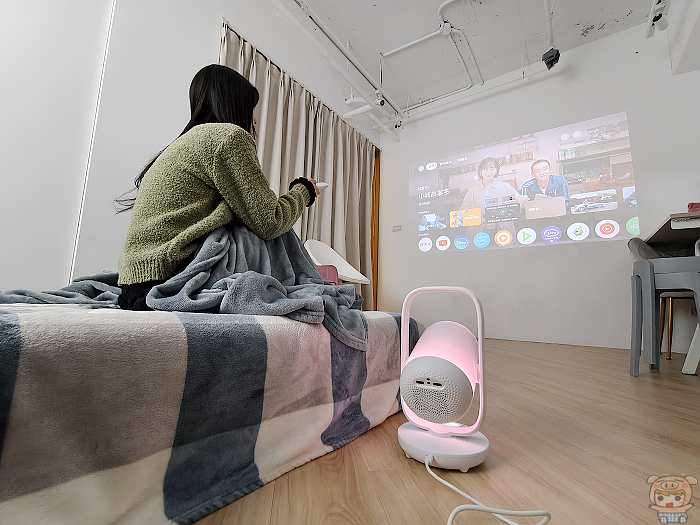 隨便找個牆就夠投影,沒有大牆面也沒關系,也可以直接投到天花板上,投影後就可以來播放個運動教學,跟著動次動次一下,就連做家事也一樣可以拿來放音樂打發時間!