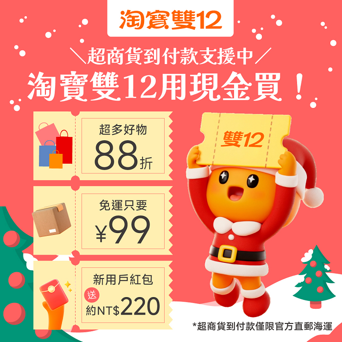 自 12月8日00:00起一路到 12月14日23:59,全站商品推出官方 88 折起優惠,每日除可領取77折折扣券外,還能疊加其他優惠券,同步享有多家信用卡與電子支付回饋;淘寶 88VIP會員再加碼人民幣780元專屬消費券,折上加折,優惠疊到最高點。萬件商品消費滿人民幣99元免費配送,沒有信用卡也能選擇7-ELEVEN 貨到付款,入手好物超輕鬆。