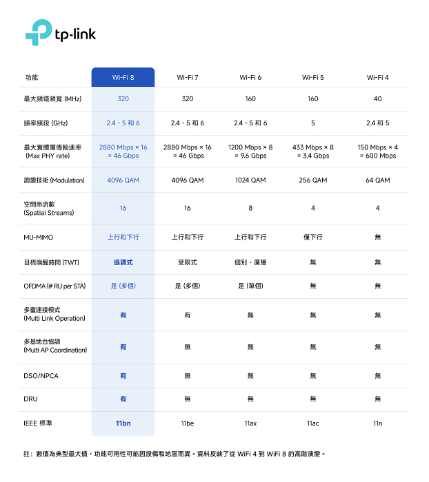 • New MCS (New Modulation and Coding Schemes)新調變與編碼方案:過去的Wi-Fi編碼方式在訊號衰減時,傳輸速率常會「階梯式」下降,如:遠離路由器時,設備的網路速度可能會突然降速,而導致延遲。為有效解決此問題, Wi-Fi 8 新增的 MCS 等級與編碼方案,讓網路下降速度「更平順」,也使得全屋都能獲得更穩定的連線及一致網路速度。