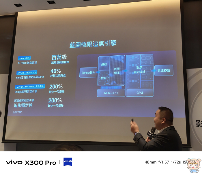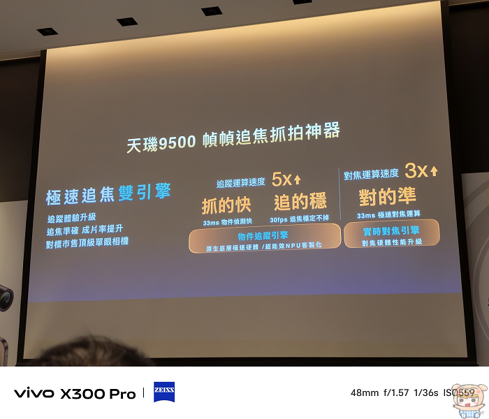 X300 Pro在高速追焦表現進化不少,搭載完整的「長焦追焦系統」,結合自研 X-Track 演算法與全新藍圖極限追焦引擎,並與聯發科技深度協作,整合雙引擎(物件追焦 + 即時對焦)與 X-Track 演算法後,對焦延遲縮短至 33 毫秒,真正達到「看到就能抓到」的精準追焦效果。