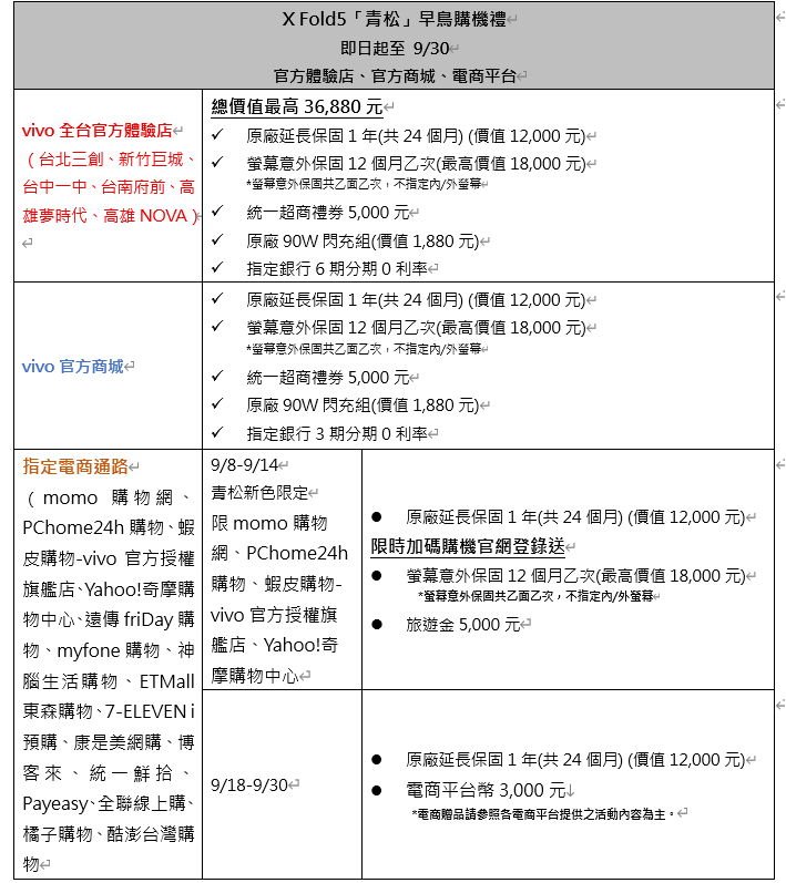★ 官方通路即日起至9月30日:於全台官方體驗店以及官方商城,購買X Fold5青松限定色,可享原廠延長保固1年、螢幕意外保固12個月乙次,再加碼贈送統一超商禮券5,000元與原廠90W閃充組,超值優惠組合讓V粉輕鬆升級大摺生活。