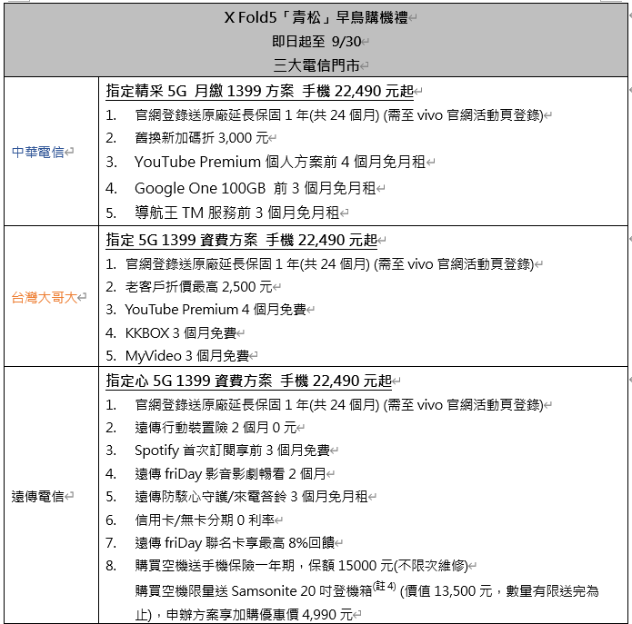 ★ 三大電信9月15日至9月30日:搭配中華電信、台灣大哥大、遠傳電信指定資費方案,vivo X Fold5享專屬優惠價,再享多重購機回饋。