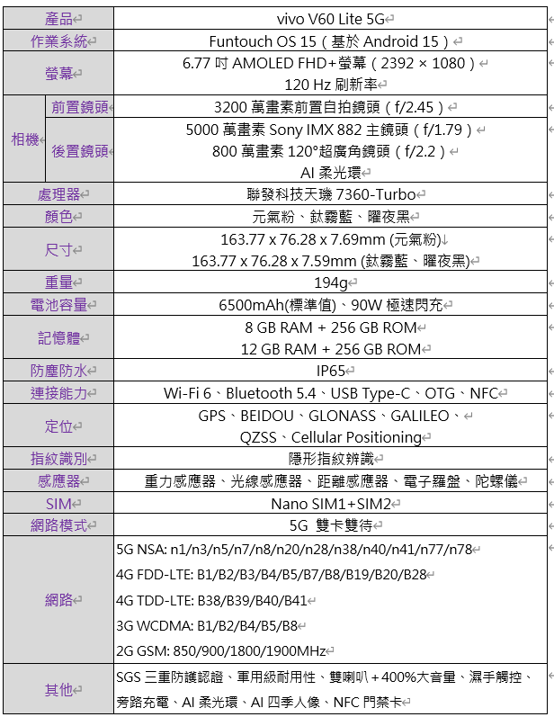 vivo V60 Lite 5G 產品規格