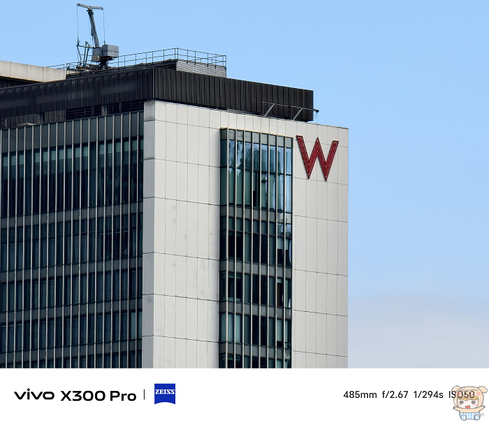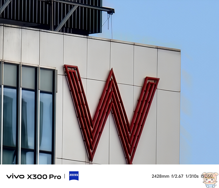 再拉到極限 100x(2428mm),W 紅色招牌結構明顯,透過 AI 演算法強化,數位裁切感也降低很多,建物與天空區域色彩過度自然。