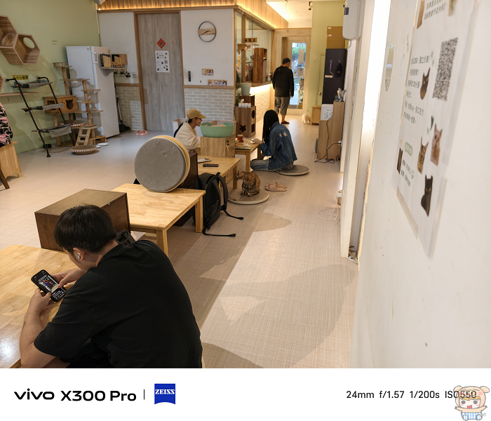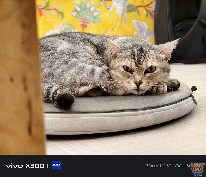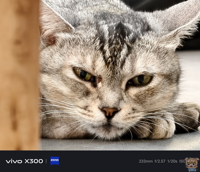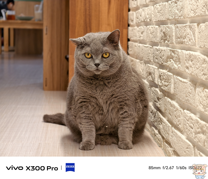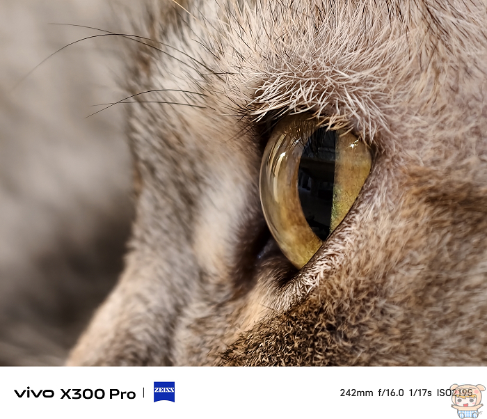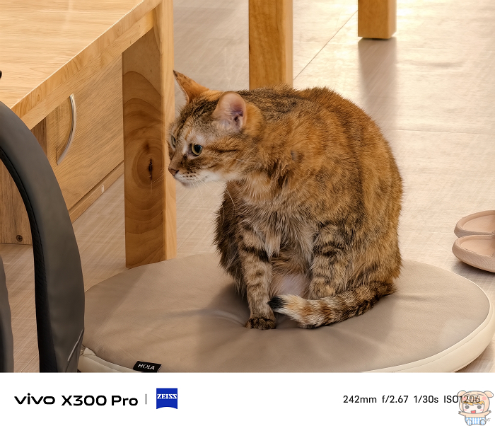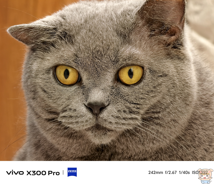 下方貓咪實拍能看到,與 1x 相比,用 10x 長焦拉近主角後,能避開周圍雜物或路人,壓縮感更凸顯主角, 畫面也展現蔡司 T*鍍膜獨有的通透感,雜色控制優秀,讓黃毛貓咪與室內昏黃環境不會融為一體,色彩也十分鮮明,綠眼睛還有討喜的光澤。