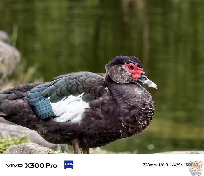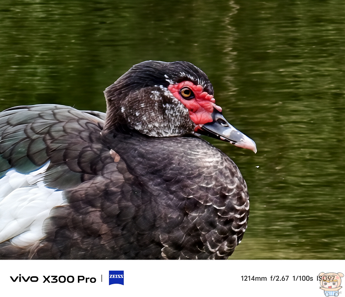 基本上,長焦在中遠距離範圍都可以捕捉到出色的影像,X300 Pro 的 50x(1214mm) 焦段,鳥上的紅、黑白色塊區域都很鮮明,水面也未受到數位雜訊太多影響,