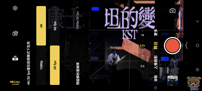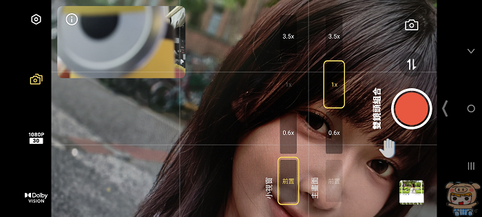 舞台模式這次還多了「雙鏡錄影」,可以同時開啟後置鏡頭和前鏡頭一起拍。開錄前要先選鏡頭拍攝倍數(像是 0.6x、1x、3.5x),還有主畫面和小視窗分別要用哪顆鏡頭,因為一旦開始錄影就不能再切換囉~