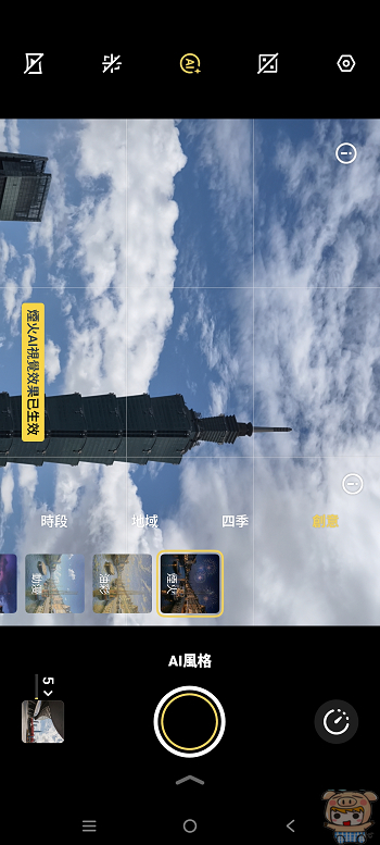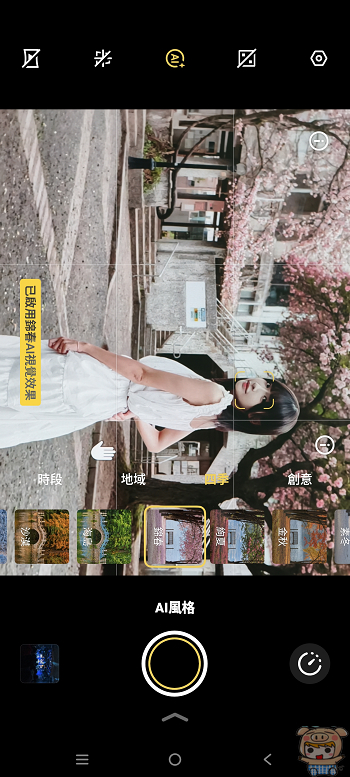 相機內的 AI 功能多達15種以上,包括四季及最新的 「地域」、「時段」及「創意」四大項,另外,再開啟此 AI 風景模式時,系統還會幫你自動消除畫面中的路人,簡化後續修圖的程序。