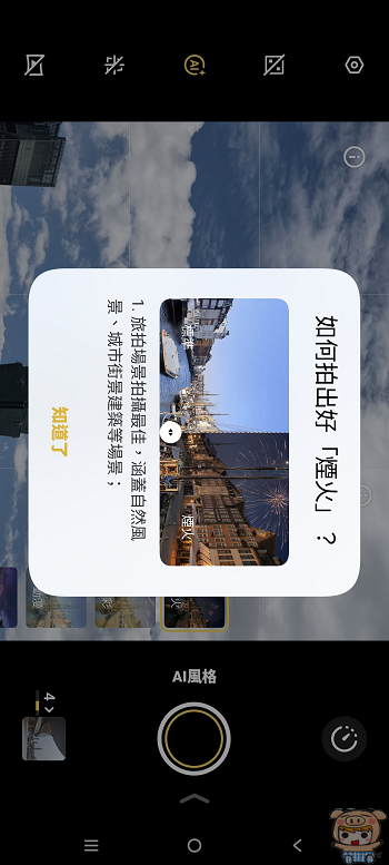 AI 風景大師還運用 AIGC 的能力,能同時替換天氣和消除路人,生成效果還滿自然,個人還滿喜歡”煙火”風景,不用怕天候不佳拉花不美,或被環境限制,相機直接幫你生成,這功能建議在夜晚拍攝效果最佳,另外,這些 AI 都需靠聯網後製,最多能生成十張照片,所以拍完時,稍等一下下就有美美的作品。
