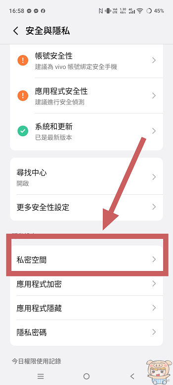 設定方式:設定>安全與隱私>私密空間設置或驗證隱私密碼,便可開啟。