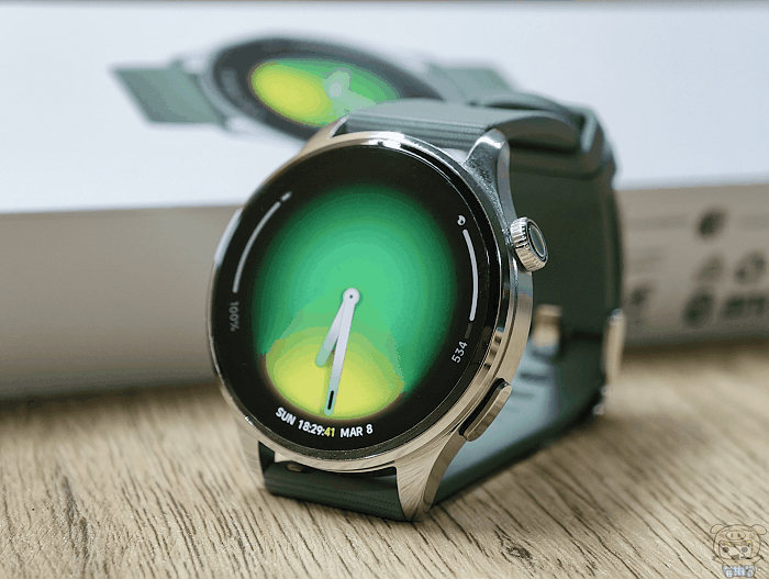 錶面比一般的手錶,都還要上大一些,1.54吋 AMOLED 螢幕,極窄邊框和極高螢幕機身比例面積,解析度為 480×480 312 PPI,60Hz螢幕更新率,亮度高達1500尼特,在戶外有陽光的地上,觀看訊息文字、畫面上的顯色也都非常的清晰。