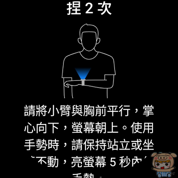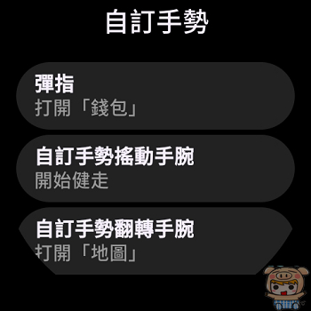 而且它還新增三種以 IMU 與 PPG 感測器為基礎的手勢辨識,援了自訂手勢的功能,像是彈手指、或是晃動、轉動手捥等,可以設定成自己最常用的功能,像開啟地圖、開啟錢包或是開啟運動模式等,超級好用的啦。